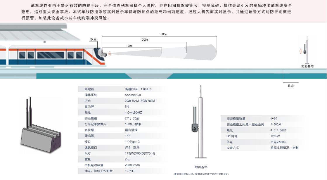 試車線作業由于缺乏有效的防護手段,完全依靠列車司機個人防控,存在因司機駕駛疲勞、視覺障礙、操作失誤引發的車輛沖出試車線安全隱患,造成重大安全事故。本試車線防撞系統實時顯示車輛與防護點的距離和當前速度,通過人機界面實時顯示,并通過語音方式對防護距離進行預警;加裝此設備減小試車線終端沖突風險。